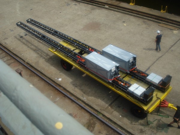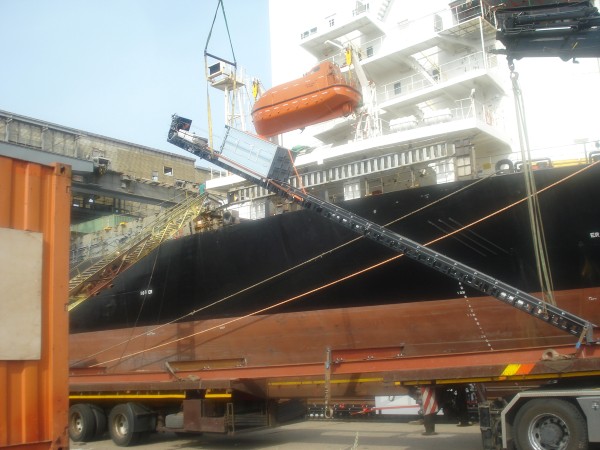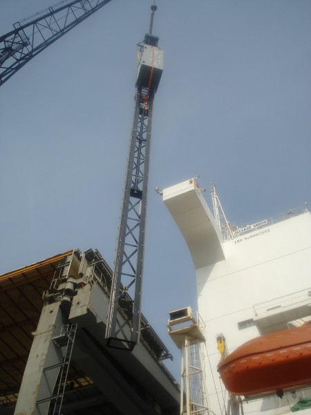 For refit works for a cargo vessel TBV Marine Systems has installed backbone elevators. Three of the cargo holes are provided with a passenger elevator (225 kg) with only two stops but a travel of 17 meters.